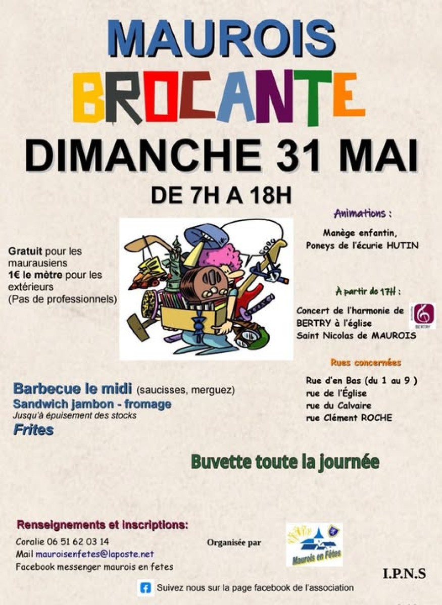 L’association Maurois en Fêtes donne rendez-vous aux habitants et visiteurs pour sa traditionnelle brocante, le dimanche 31 mai 2026, de 7h à 18h, au cœur du village.
