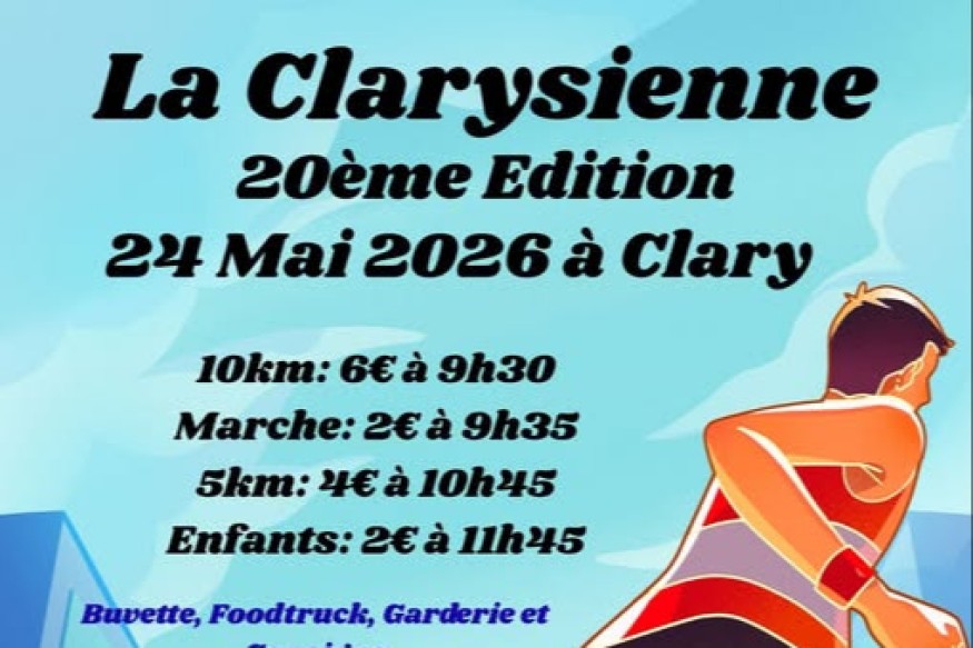 La Clarysienne fête sa 20ème édition à Clary ! Le Comité des Fêtes de Clary vous donne rendez-vous le dimanche 24 mai 2026 pour célébrer la 20ème édition de La Clarysienne, un événement sportif et convivial devenu incontournable dans la région. Au programme de cette journée ouverte à tous : Course 10 km – départ à 9h30 (6 €) Marche – départ à 9h35 (2 €) ...