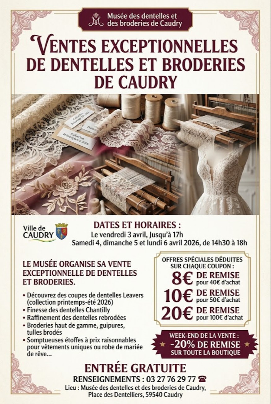 CAUDRY, France – Le Musée des dentelles et des broderies de Caudry est ravi d'annoncer la tenue de sa vente exceptionnelle annuelle, un événement incontournable pour les passionnés de textiles d'exception, les créateurs de mode et les futures mariées. La vente se déroulera sur quatre jours, du vendredi 3 avril au lundi 6 avril 2026.