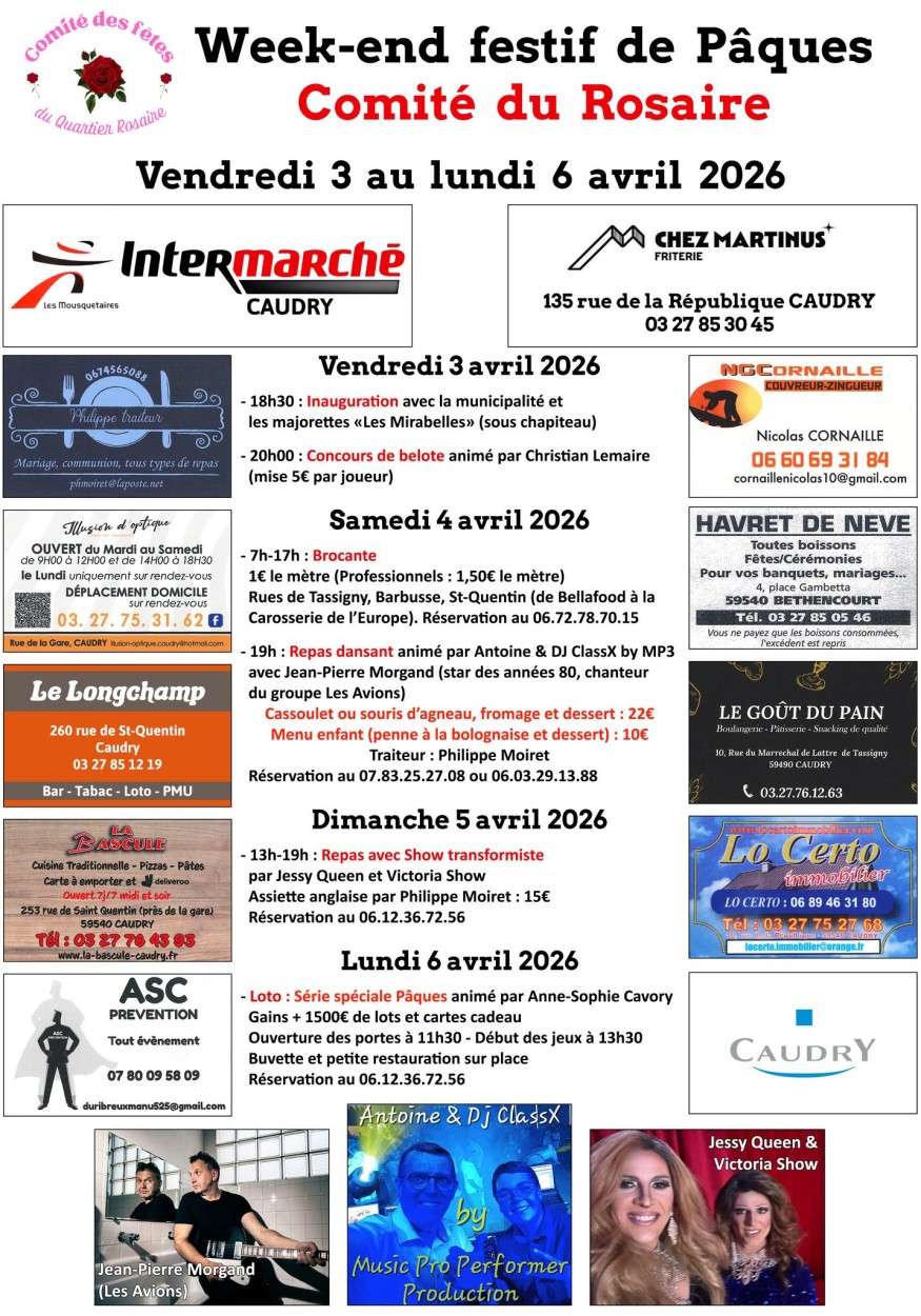 À l’occasion des fêtes de Pâques, le Comité du Rosaire de Caudry propose un grand week-end d’animations du vendredi 3 au lundi 6 avril 2026. Un programme riche et varié attend petits et grands, mêlant convivialité, musique, gastronomie et divertissement.
