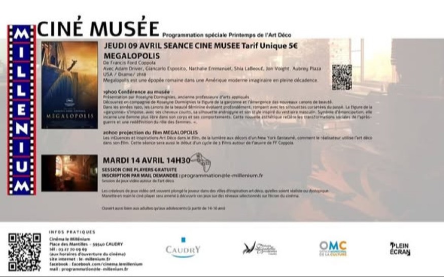 Le jeudi 9 avril prochain, le Musée des Dentelles et Broderies et le cinéma Le Millenium de Caudry s’associent pour proposer une soirée culturelle unique sous le signe de l’Art Déco. Au programme : une conférence sur la révolution esthétique des années 1920 suivie de la projection du film événement de Francis Ford Coppola, « Megalopolis ».